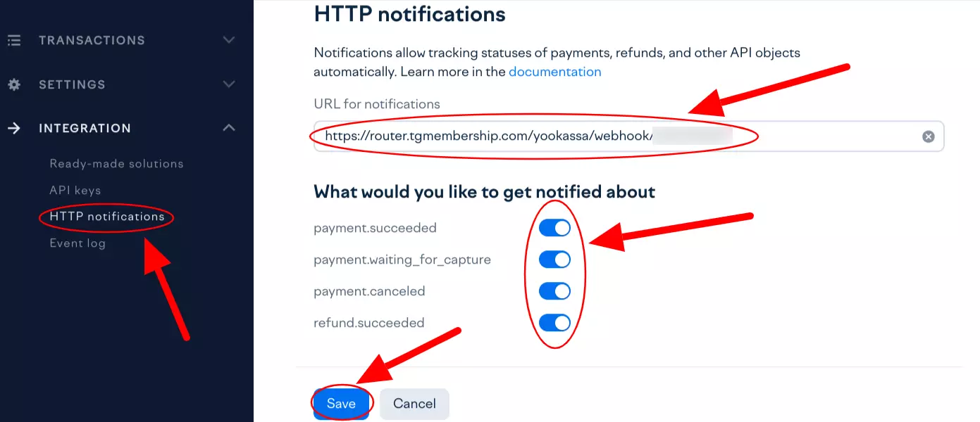 Once you've selected YooKassa as your payment method in your bot's settings, the next crucial step is configuring HTTP notifications. Your bot will provide you with an HTTP notifications URL. To complete this setup, head over to your YooKassa dashboard, find "Integration," and then select "HTTP notifications." In the "URL for notifications" field, paste the URL provided by your bot. Ensure that you've selected all events, and finally, click "Save."